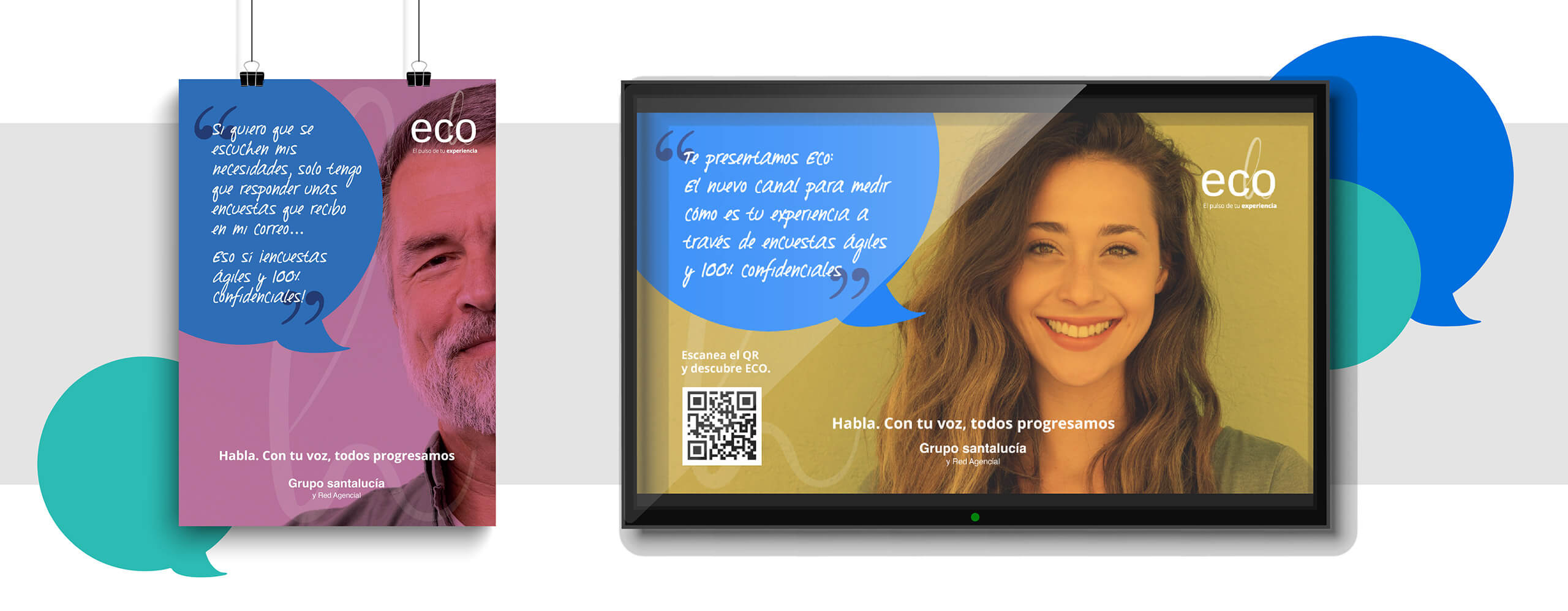 Desarrollo: Hicimos un despliegue de piezas en el que había dos elementos comunes. Las personas y la ilustración de bocadillos de conversación. A partir de ahí generamos una campaña para mostrar que si ellos tienen algo que decir, la empresa tiene algo que escuchar.